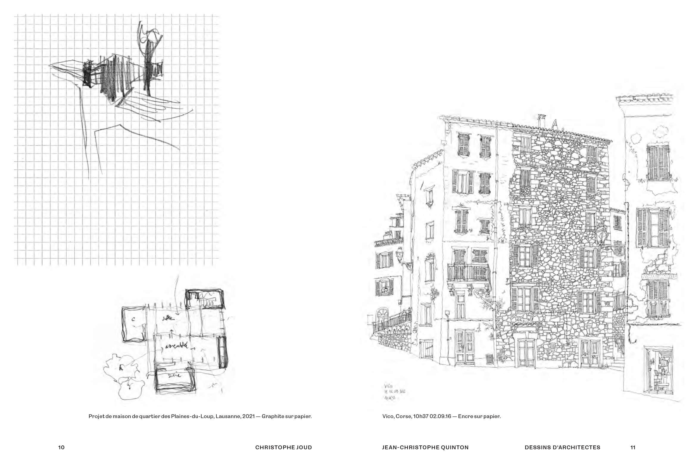 L'architecte est un intellectuel qui dessine : les dessins réalisés « à la main » par 24 architectes contemporains, rassemblés par Bernard Quirot. Il existe des architectes qui ne dessinent jamais et, du fait de la numérisation généralisée de notre monde, certains ne dessinent que par l'intermédiaire de leur ordinateur se privant ainsi de la liberté offerte par le parcours du crayon sur le papier. Mais, pour d'autres, le dessin « à la main » reste un outil indispensable pour enregistrer et transformer le monde. Enregistrer parce que, comme le disait l'architecte tessinois Luigi Snozzi : Rien n'est à inventer, tout est à réinventer. Dessiner, par exemple à l'occasion d'un voyage, c'est enfouir au fond de sa mémoire des atmosphères, des formes, des proportions. Et dessiner un projet pour transformer le monde, c'est aller rechercher au fond de sa mémoire ces atmosphères, ces formes et ces proportions pour réinventer une architecture. Le plus souvent ce processus est inconscient. En effet, nombreux sont ceux qui pensent que la main produit des formes que le cerveau n'a pas eu le temps de conceptualiser comme semblent le prouver certaines recherches dans le domaine de la neurologie. C'est ainsi que le voyage d'étude est intimement lié à la figure de l'architecte et certains voyages ont été fondateurs dans leur formation. On pense évidemment au voyage d'Italie de Viollet-le-Duc, au voyage d'Orient de Le Corbusier, à la découverte de la Rome antique par Louis Kahn et à bien d'autres encore. L'architecte est un intellectuel qui dessine.
