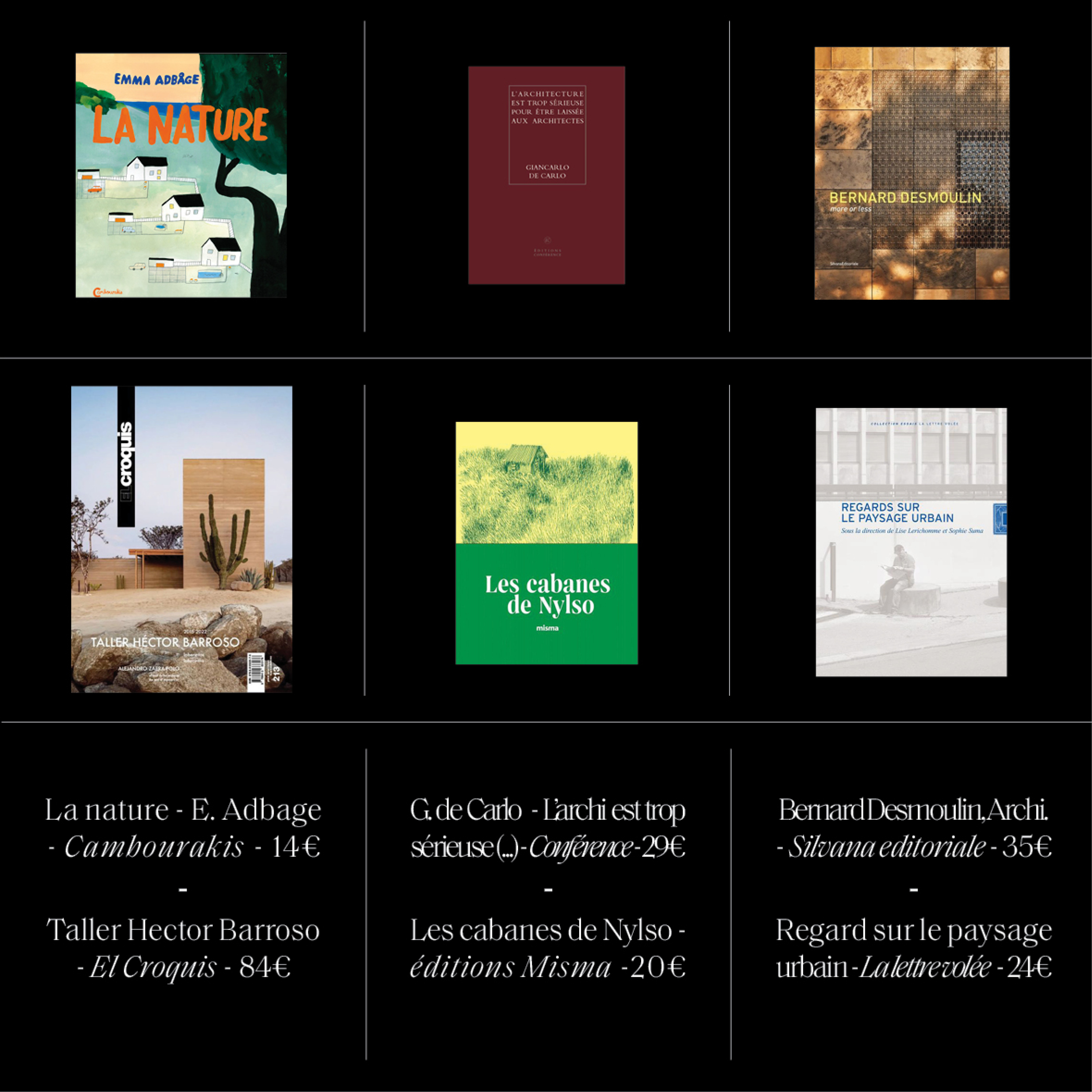 Des sélections d’ouvrages regroupés selon des thèmes : l’actualité architecturale, les classiques à lire, les saisons littéraires, etc.