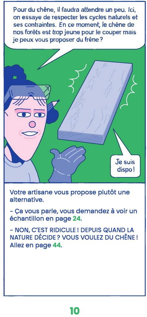 Conçu par la menuiserie Gris Bois en partenariat avec les Éditions 2024 et Timothée Ostermann, ce livre dont vous êtes le héros est une épopée ludique et sarcastique traversant le monde de la menuiserie. Il questionne les rapports que nous avons avec la matière bois, mais décrit aussi nos paysages intérieurs autour de la normalisation et de la grande industrialisation des meubles et du lien que cela porte dans nos paysages extérieurs, au travers de nos forêts et de notre relation avec le vivant et la biodiversité.