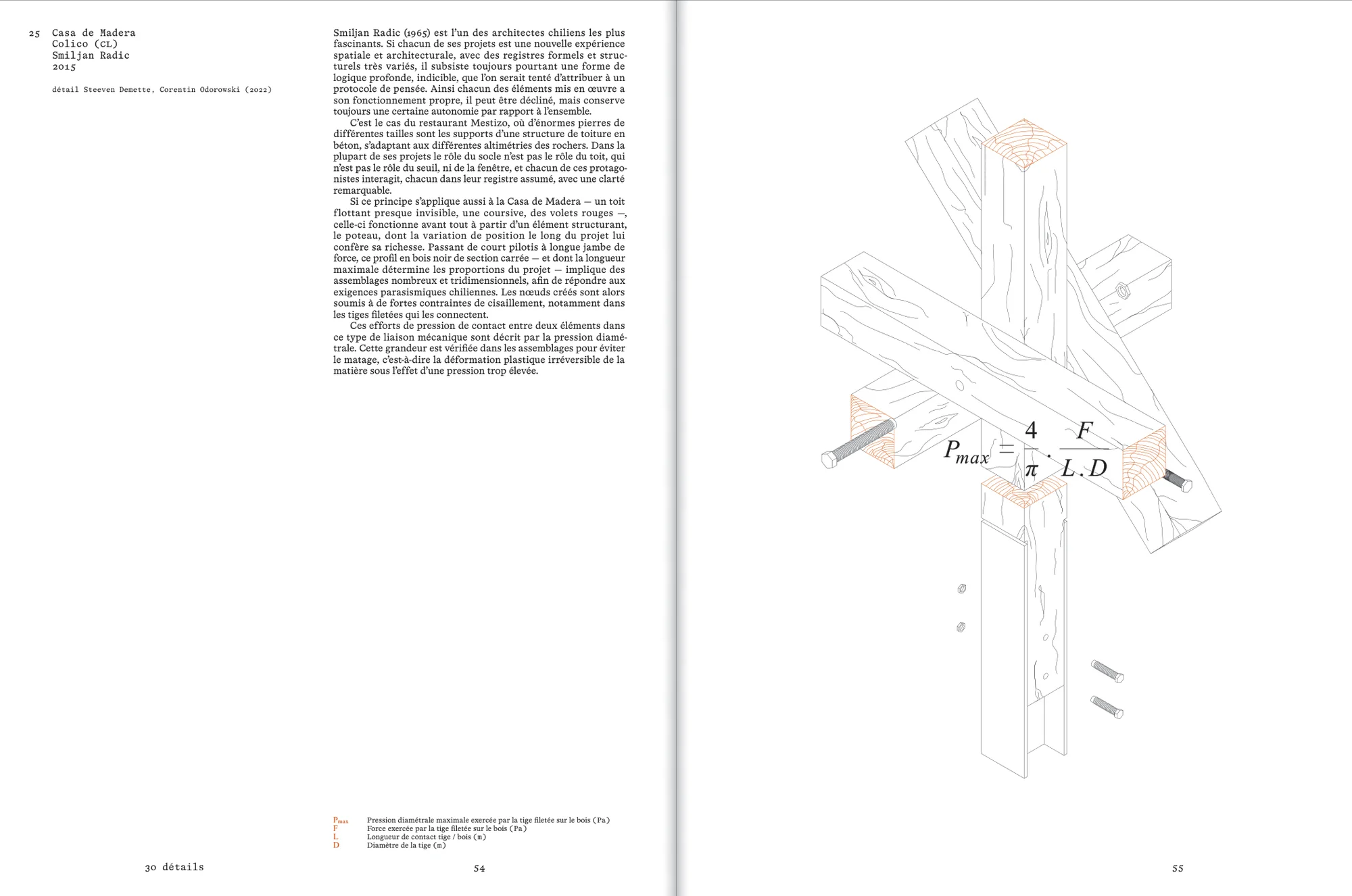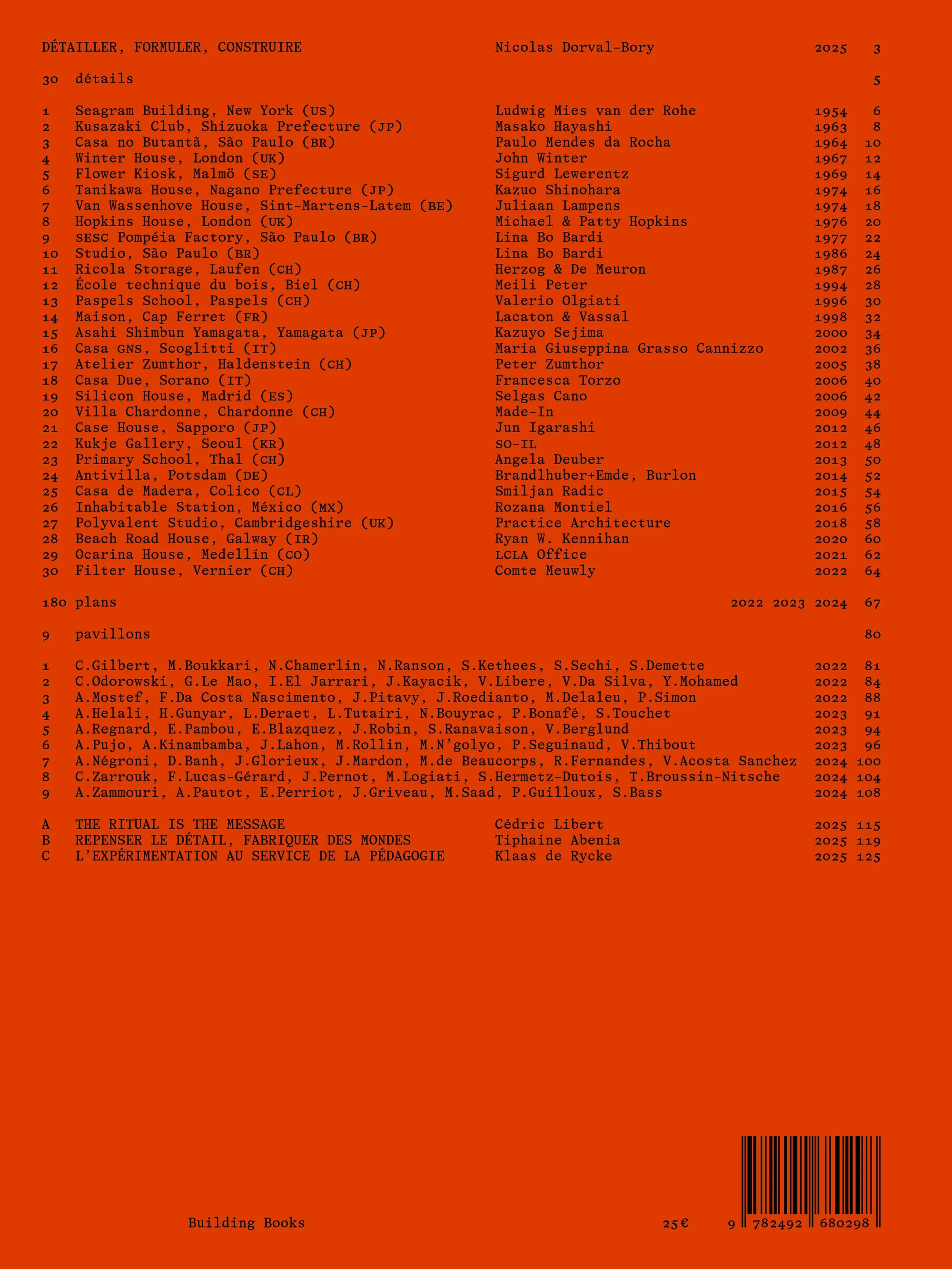 Détailler, formuler, construire présente les travaux des étudiant·es de 1ère année de la formation architecte-ingénieur à l’ENSA Versailles et à CY Tech, dirigés par Nicolas Dorval-Bory entre 2022 et 2024. Le livre combine analyse et dessin de détails constructifs avec la construction à l’échelle 1 de pavillons en bois, offrant une exploration concrète et expérimentale de l’architecture. Il documente des bâtiments emblématiques du XXe et XXIe siècle, montre les pavillons réalisés par les étudiant·es et propose des réflexions critiques sur l’apprentissage par le «faire». Destiné aux étudiant·es, enseignant·es et professionnel·les, il constitue une ressource précieuse pour comprendre les principes fondamentaux de l’architecture et leurs prolongements contemporains.